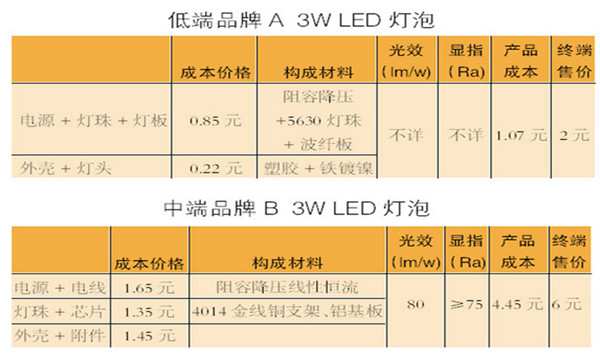 從圖中,可以看到低端3WLED燈泡電源使用的是阻容降壓、5630的燈珠、玻纖板的燈板,成本價(jià)只需1.07元,可光效、顯指這些參數(shù)卻不得而知。而中端3WLED燈泡的材料是阻容降壓線性恒流的電源電線,4014金線銅支架、鋁基板,成本價(jià)比低端產(chǎn)品的高出了3倍,80lm/w的光效等參數(shù)皆有。明顯的中端產(chǎn)品各部件材料價(jià)格都比低端產(chǎn)品高出幾倍,從而終端售價(jià)也高了4元。