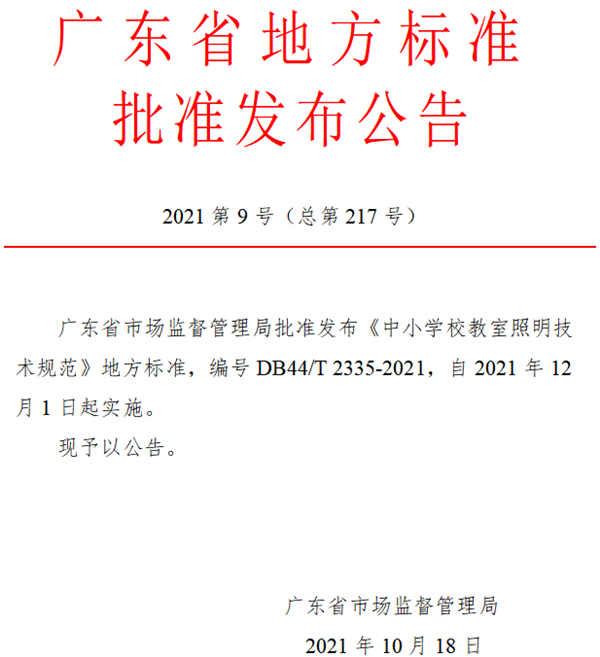《中小學校教室照明技術規范》該標準于2021年12月1日起正式實施。發布會還透露:2023年廣東省將全面完成中小學校教室照明達標任務。